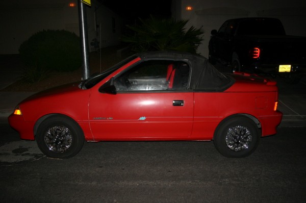 Ok, so it’s not really new… it’s “new to me”.  I bought a 1991 Geo Metro LSi convertible from the original ownwer (or so he says) for $1,000.  It has new tires, new brakes, the original top and seat covers.  Oh, the a/c works and it has a CD player.